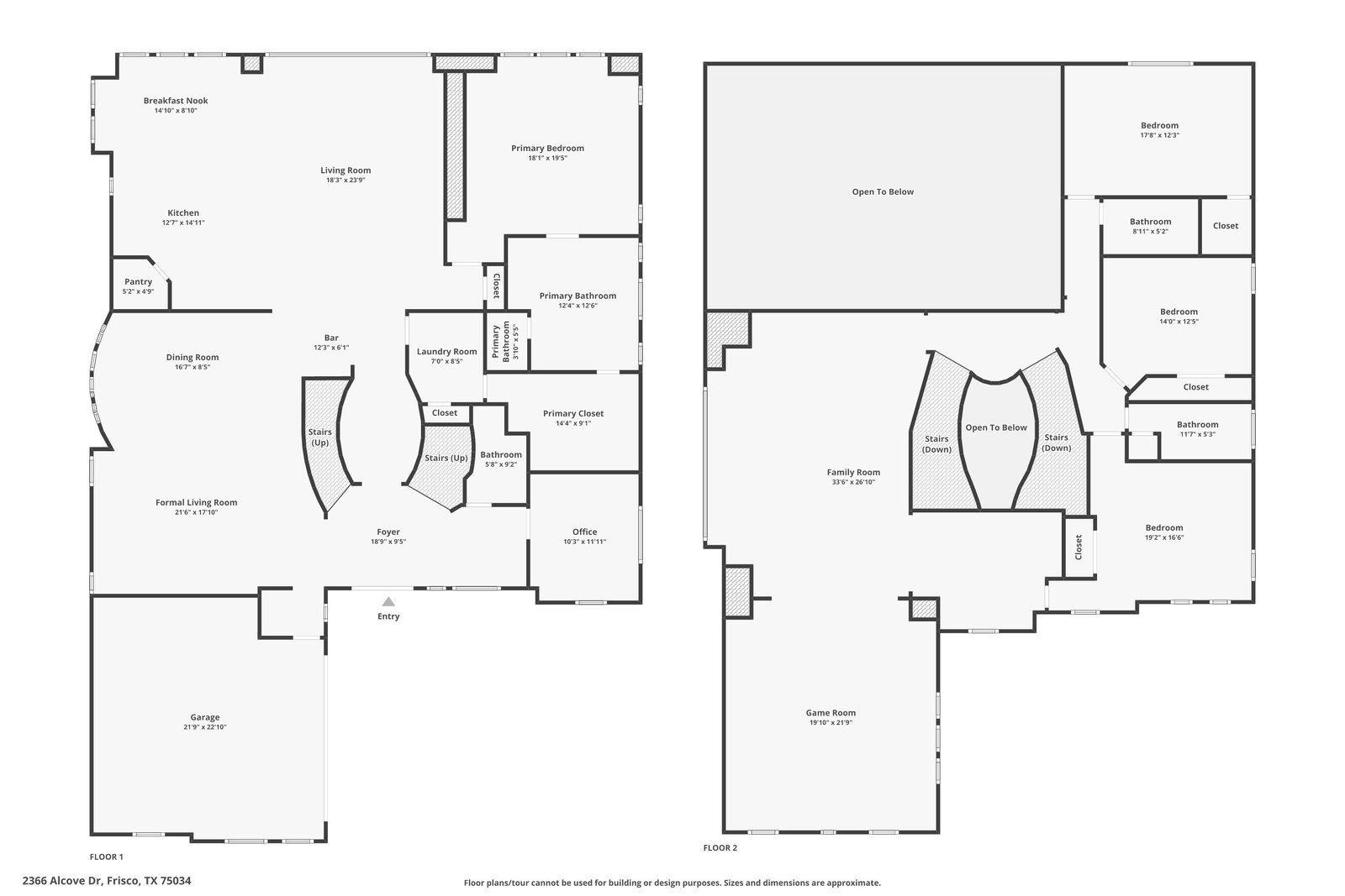 This curated residence located in the gated community, Hills of Kingswood, was designed intentionally to set a dramatic tone in every room. Starting with the high-impact kitchen which is anchored by a black quartz waterfall island with a brushed brass coiled-spring faucet. Kitchen backsplash impresses with a full-height bookmatched tile wall, creating a seamless and luxurious statement complete with floating kitchen shelves, decorative white vent hood and matte-black sconces. Main living space is defined by a dramatic floor-to-ceiling feature wall, complete with sleek electric fireplace and 2-story decorative lighting - emphasizing the room’s soaring scale. Additionally, a sliding glass door system blurs the line between indoors and out, offering incredible natural light and an effortless flow for entertaining. Formal dining, lounge and bar areas continue the curated aesthetic, boasting a striking brushed brass globe chandelier over the lounge space & a woven pendant dining chandelier which softens the adjacent dining nook with its organic texture. Primary suite is a statement unto itself, with marble-inspired tile flooring and coordinating accent wall. En suite bath impresses with freestanding tub, dual vanities with black marble counters, and dual-headed shower. Spacious primary closest completes the space with direct laundry access. Main floor also boasts a dedicated office, offering flexibility to serve as a guest suite, with access to a striking secondary full bath finished in bold patterned tile and designer wallpaper. Upstairs, along with 3 beds & 2 full baths, opens to an expansive retreat with three distinct living areas. Offering endless opportunities for customization; whether envisioned as media, game, library, workout, second office, or playroom, this versatile space adapts to every lifestyle. Incredible location with quick access to scenic walking trails, Lake Lewisville, Legacy West, The Star, and Frisco’s premier dining and shopping destinations.